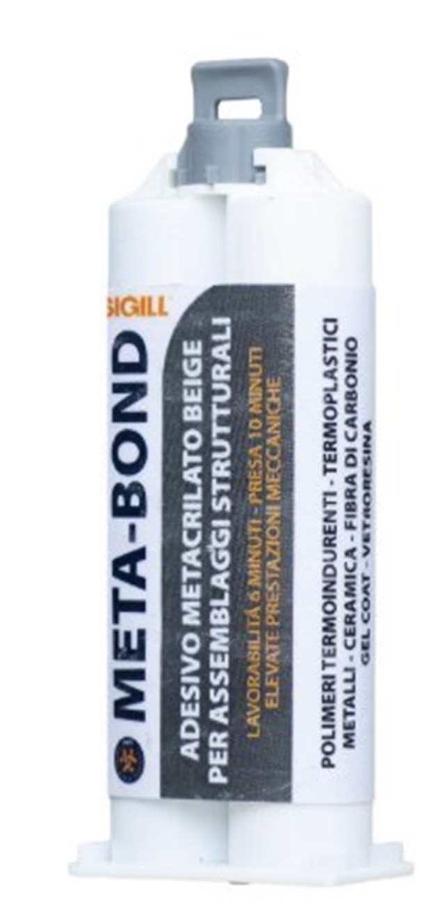 Adesivo metacrilato bicomponente tissotropico per assemblaggi strutturali Meta-Bond è un adesivo strutturale bicomponente tixotropico a base di metacrilato, appositamente progettato per riparazioni e assemblaggi strutturali tra materiali anche eterogenei. Meta-Bond quali polimeri termoindurenti, termoplastici, metalli, ceramica, fibra di carbonio, gel coat, vetroresina, materiali naturali e superfici verniciate. Meta-Bond polimerizza a temperatura ambiente in modo rapido e garantisce una ottima resistenza sia al taglio che in trazione; dopo una completa polimerizzazione sarà possibile sovraverniciarlo. Aree di applicazione Meta-Bond è idoneo per l’assemblaggio di molteplici materiali nel settore automotive, industriali e nautica. Grazie alle sue caratteristiche Meta-Bond permette di incollare, fissare e riparare parti di mezzi pesanti, camper o autovetture come serbatoi, paraurti, pannelli, staffe. Nel settore industriale si può applicare per fissare staffe metalliche o plastiche, perni, accoppiaggi in genere, può sostituire la saldatura a caldo in zone difficili o facilmente deformabili. Nel settore della nautica si può applicare per il fissaggio o la riparazione su vetroresina di passacavi, staffe, piastre di montaggio, elementi strutturali da fissare allo scafo. Caratteristiche speciali • Polimerizzazione rapida • Di facile applicazione • Non cola in applicazioni verticali, riempie fessure e irregolarità • Gamma di adesioni molto ampia • Alta resistenza meccanica e agli stress dinamici • Consente la saldatura a punti prima della polimerizzazione • Può essere carteggiato e sovraverniciato • Buona resistenza agli acidi, alle basi e a idrosolventi idrocarburi
