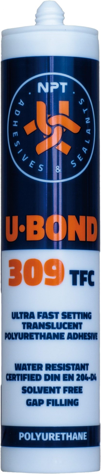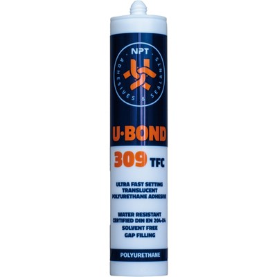 U-Bond 309TFC è un adesivo poliuretanico in pasta igroindurente monocomponentetraslucido e rapido, privo di solventi, adatto per l'incollaggio flessibile di legno, derivati del legno e diversi materiali da costruzione per l'assemblaggio generale. Tissotropico, è adatto per applicazioni verticali senza colature. Ottima resistenza all'acqua, alle temperature, agli agenti atmosferici e all'invecchiamento secondo EN 204 D4. Aree di applicazione U-Bond 309TFC è adatto per l'assemblaggio generale di materiali a presa rapida attraverso l'applicazione di cordoni, applicazioni esterne per la lavorazione del legno, incollaggio strutturale di legno e prodotti derivati come truciolare, compensato, laminato ad alta pressione (HPL),materiali isolanti come XPS, PU e schiuma rigida in PVC, GRP, metalli, alluminio, acciaio inossidabile, acciaio zincato, materiali da costruzione come pietra naturale, marmo, ceramica. Ideale per incollaggi con linea invisibile grazie alla sua traslucenza. Conforme a: EN 204 D4 LEED iEQc 4.1; Regola SCAQMD 1168; BAAQMD Reg 8 Regola 51 Regolamento CARB VOC