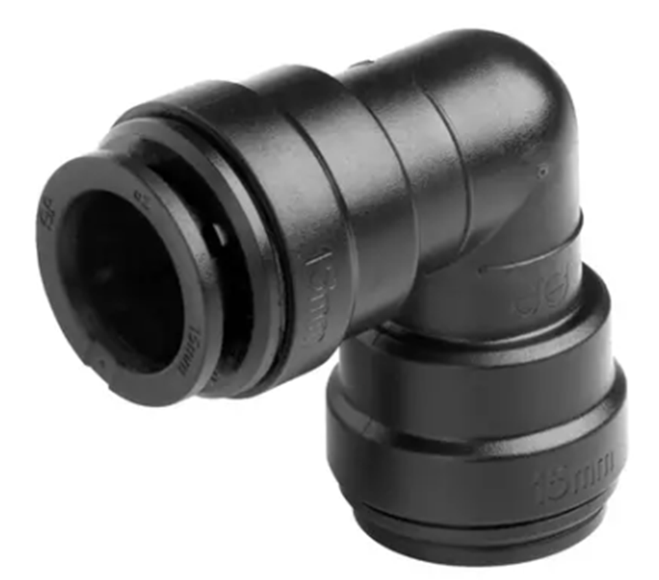 L’intermedio a gomito a innesto rapido John Guest collega due tubi di dimensioni uguali per formare una curva a 90° del tubo