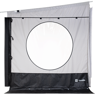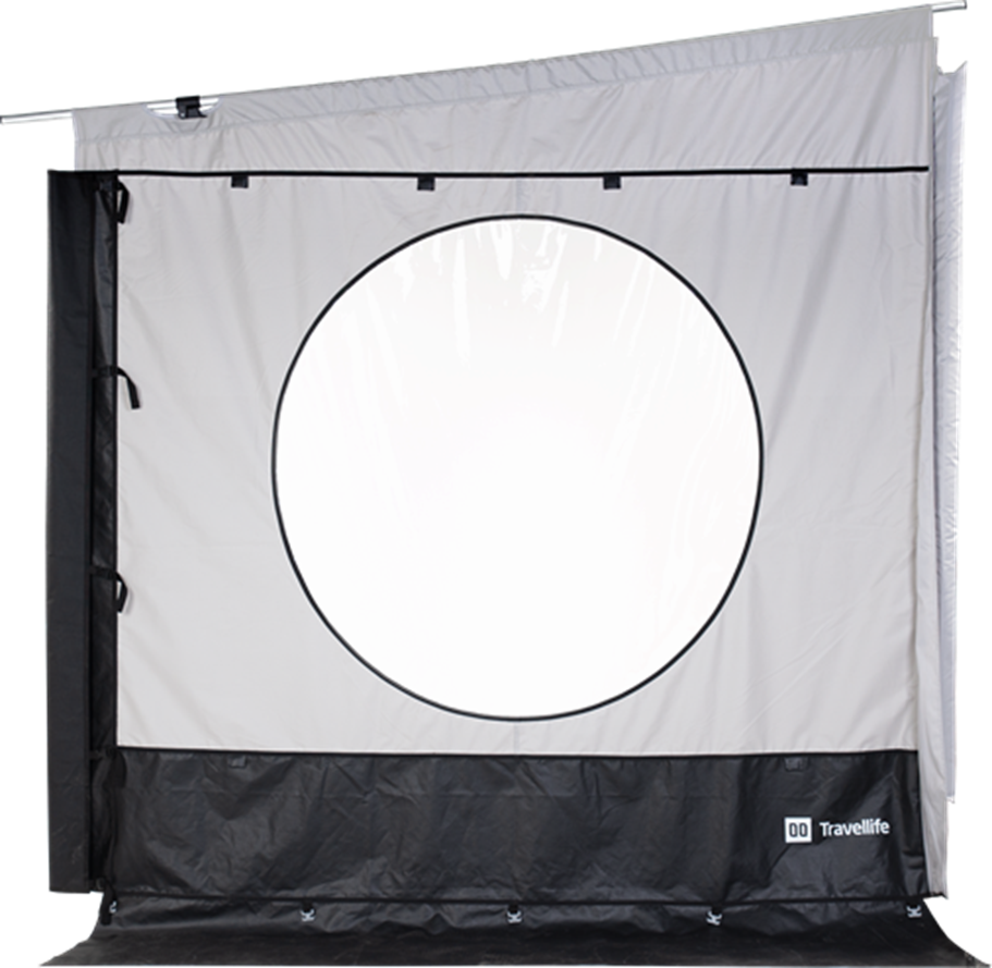 Espandi il tuo tendalino Thule, Fiamma o Dometic con il pannello laterale universale Scala con finestre rotonde. Basta stringere il pannello laterale con il sistema di blocco intelligente. Il pannello laterale può essere fissato a sinistra e a destra. Le finestre rotonde con oscuranti offrono una protezione sufficiente dal vento e dalla pioggia.