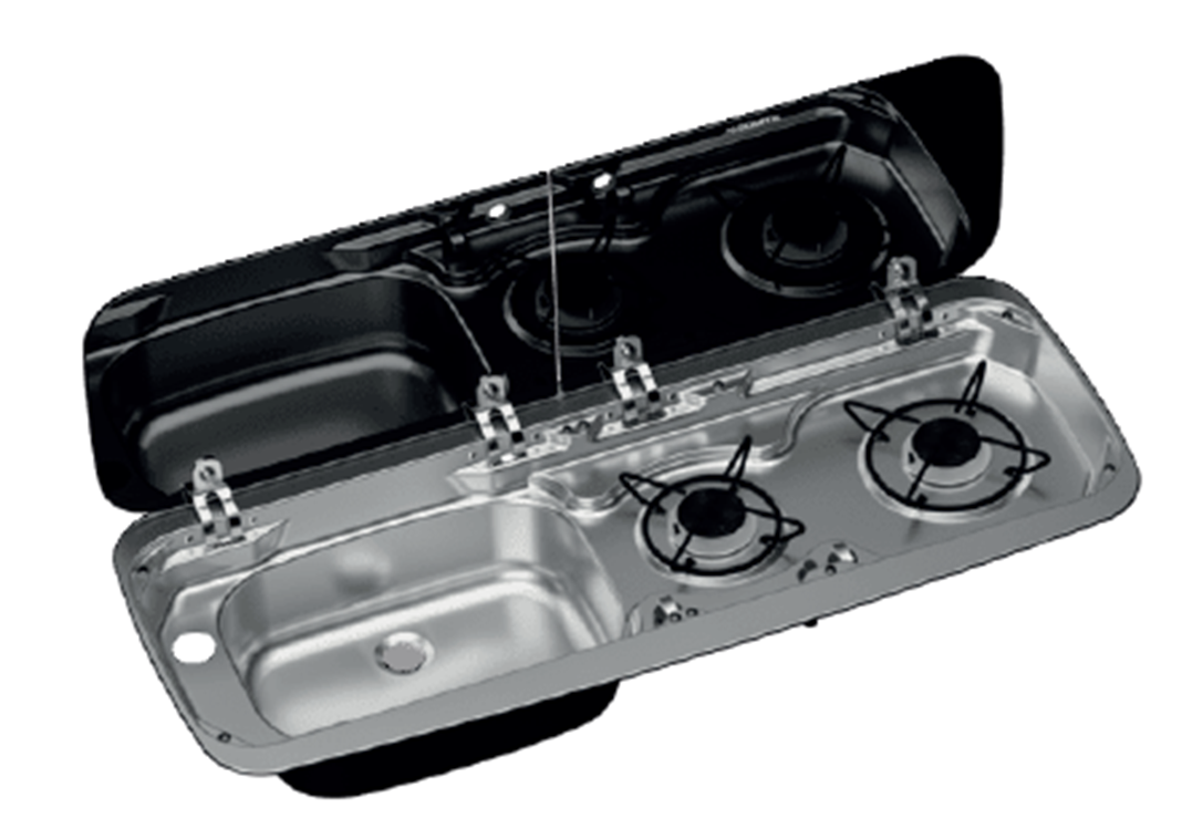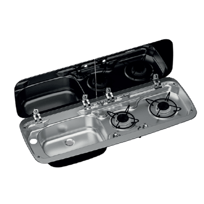 Combinazione di piano cottura a 2 fuochi e lavello con coperchio in vetro resistente alle alte temperature.